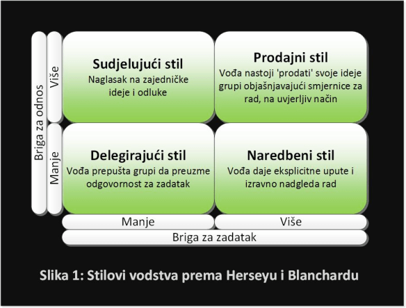 Prema Herseyu i Blanchardu, menadžeri koji najviše brinu o izvršenju konkretnog zadatka nastojat će prenijeti njegovo izvođenje na svoje podređene naređivanjem (naredbeni stil), malo brinući o odnosu s podređenima. Oni koji uz brigu o konkretnom zadatku brinu i za odnose s podređenima pokušat će uvjeravanjem privoljeti podređene da izvrše zadatak (prodajni stil). Oni koji više brinu za odnose s podređenima nego za sam konkretni zadatak uključiti će podređene u proces planiranja i donošenja odluka (sudjelujući stil). Oni koji nisu naročiti zainteresirani niti za sam zadatak niti za odnose s podređenima prepustit će podređenima da sami odluče kada i kako će izvršiti zadatak (delegirajući stil).